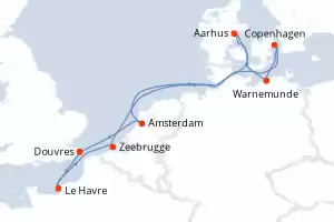 Itinerary : Dover, Le Havre, Zeebrugge, Copenhagen, Warnemunde, Arhus, Amsterdam, Dover