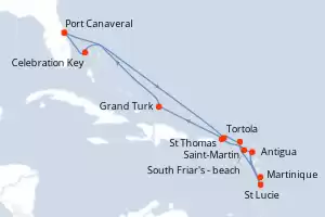 Itinerary : Port Canaveral, Celebration Key, Tortola, Saint-Martin, Martinique, St Lucie, Antigua, South Friar's - beach, St Thomas, Grand Turk, Port Canaveral