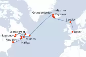 Itinerary : Dover, Lerwick, Reykjavik, Grundarfjordur, Isafjodhur, St Johns, Brook corner, Quebec City, Saguenay, Charlottetown, Sydney, Halifax, New York