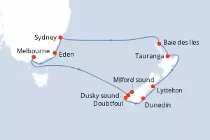 Itinerary : Sydney (Australia), Eden, Melbourne, Doubtfoul, Milford Sound, DUSKY Sound, DUnedin, Lyttelton, Tauranga, Bay of Islands, Sydney (Australia)