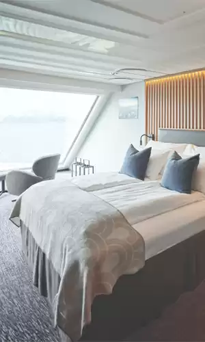 The cabins and suites on board Havila Voyages offer a high standard of hotel-style comfort. Each one is a cocoon of clean Nordic design, far more spacious than the usual average on this route. Large windows (even in some standard categories) mean you will not miss any of the natural spectacle outside. The suites, often located at the front or rear of the ships, feature spectacular private balconies and thoughtful services (exclusive breakfast, priority boarding), ensuring a highly exclusive experience in direct contact with the elements.