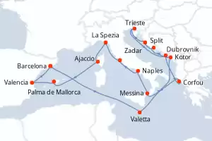 Itinerary : Barcelona, Valetta, Kotor, Split, Zadar, Trieste, Dubrovnik, Corfu, Messina, Naples, Civitavecchia / Rome, La Spezia, Ajaccio, Palma de Mallorca, Valencia, Barcelona