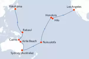 Itinéraire : Yokohama, Rabaul, Cairns, Airlie Beach, Sydney, Nukualofa, Ligne de changement de date, Honolulu, Hilo, Los Angeles