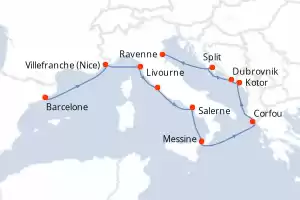 Itinéraire : Barcelone, Villefranche (Nice), Livourne, Civitavecchia - Rome, Salerne, Messine, Corfou, Kotor, Dubrovnik, Split, Ravenne