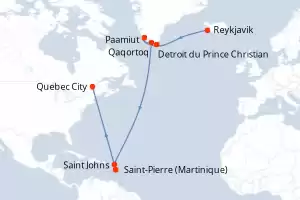 Itinéraire : Reykjavik, Detroit du Prince Christian, Paamiut, Qaqortoq, Saint Johns, Saint-Pierre (Martinique), Quebec