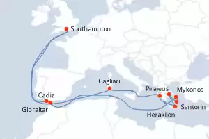 Itinéraire : Southampton, Cadix, Mykonos, Santorin, Le Piree - Athenes, Heraklion, Katakolon, Cagliari, Gibraltar, Southampton