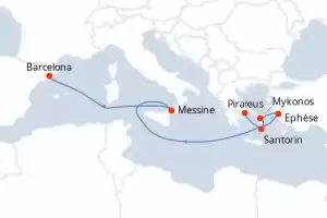 Itinéraire : Le Piree - Athenes, Mykonos, Santorin, Ephèse, Messine, Barcelone