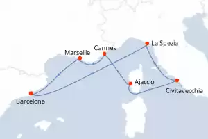 Itinéraire : Barcelone, La Spezia, Civitavecchia - Rome, Ajaccio, Cannes, Marseille, Barcelone