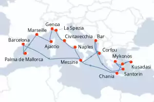 Itinéraire : Civitavecchia - Rome, Naples, Chania, Kusadasi, Mykonos, Le Piree - Athenes, Santorin, Bar, Corfou, Messine, Barcelone, Palma de Majorque, Marseille, Ajaccio, Genes, La Spezia, Civitavecchia - Rome
