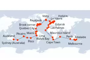 Itinéraire : Sydney, Melbourne, Adelaide, Perth, Ile Maurice, Cape Town, Walvis Bay, Mindelo, Las Palmas, Casablanca, La Corogne, Le Havre, Bruges, Gdansk, Visby, Helsinki, Tallinn, Stockholm, Copenhague, Ijmuiden (Amsterdam), Douvres, Lerwick, Reykjavik, Grundarfjordur, Isafjordhur, St Johns CA, Corner Brook, Quebec, Saguenay, Charlottetown, Sydney CA, Halifax, New York, Miami, Carthagene CO, Gatun, Manta, Lima, Pisco, Hango Roa - Ile de Paques, Pitcairn, Papeete, Moorea, Auckland, Sydney, Brisbane