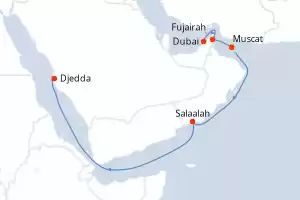 Itinéraire : Dubai, Fujairah, Muscat, Salaalah, Djedda, Aqaba, Safaga, Canal de Suez, Alexandrie, Chania, Katakolon, Syracuse (Sicile), La Valette, Tunis, Trapani, Lipari, Sorrente, Civitavecchia - Rome, Barcelone