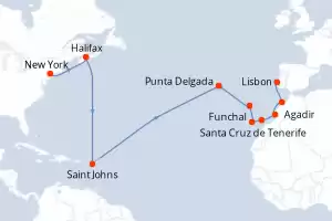 Itinéraire : New York, Halifax, Saint Johns, Punta Delgada, Funchal, Santa Cruz de Tenerife, Arrecife, Agadir, Casablanca, Lisbonne