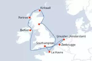Itinéraire : Southampton, Le Havre, Edimbourg, Kirkwall, Portree, Belfast, Dun Laoghaire, Ijmuiden (Amsterdam), Zeebrugge, Southampton