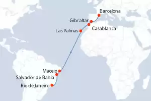 Itinéraire : Barcelone, Gibraltar, Casablanca, Las Palmas, Maceio, Salvador de Bahia, Rio de Janeiro