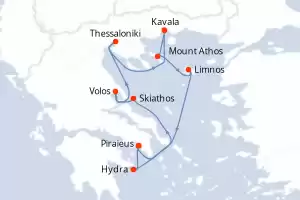 Itinéraire : Le Piree - Athenes, Skiathos, Volos, Thessalonique, Kavala, Mont Athos, Limnos, Hydra, Le Piree - Athenes