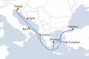 Itinéraire : Istanbul, Corfou, Bari, Trieste, Split, Le Piree - Athenes, Kusadasi, Istanbul