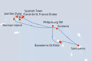 Itinéraire : Saint Johns, Gustavia, Canal de St. Francis Drake, Norman Island, Jost Van Dyke, Sopers Hole, Spanish Town, Iles Vierges, Saint-Martin (Philipsburg), Basseterre (St Kitts), South Friar's - plage, Saint Johns