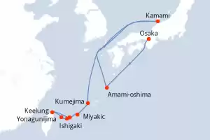 Itinéraire : Osaka, Amami-oshima, Madalena, Kamami, Kumejima, Miyako, Taketomi jima, Iriomote-jima, Yonagunijima, Keelung, Ishigaki