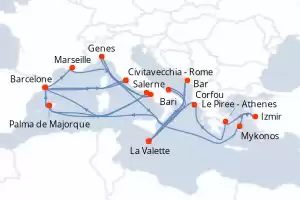 Itinéraire : Civitavecchia - Rome, Barcelone, Marseille, Salerne, Genes, Mykonos, Izmir, Le Piree - Athenes, Corfou, La Valette, Bar, La Valette, Bari, Palma de Majorque, Naples, Barcelone, Palma de Majorque, Barcelone, Civitavecchia - Rome