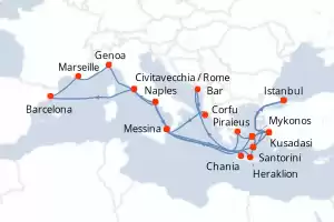 Itinéraire : Istanbul, Kusadasi, Santorin, Mykonos, Chania, Messine, Naples, Civitavecchia - Rome, Barcelone, Marseille, Genes, Civitavecchia - Rome, Naples, Heraklion, Santorin, Kusadasi, Mykonos, Le Piree - Athenes, Bar, Corfou, Messine, Santorin, Mykonos, Kusadasi, Istanbul