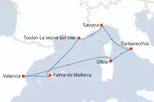 Itinéraire : Olbia, Civitavecchia - Rome, Savone, Toulon La seyne sur mer, Palma de Majorque, Valence, Olbia